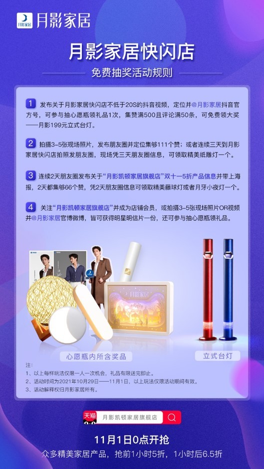 線下快閃店活動期間,現(xiàn)場參與打卡即可參與免費抽獎,代言人楊洋驚喜周邊、月影時尚可移動立式臺燈、精美紙雕燈、藤球燈以及月牙小夜燈等超多精美禮品等你來拿。