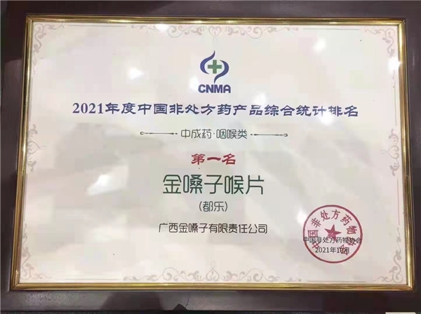 昨日,由中國非處方藥物協(xié)會主辦的“2021健康中國——首屆中國OTC大會”在廣州隆重開幕。大會第一天,中國OTC品牌盛典就掀起了第一輪高潮,2021年度OTC企業(yè)及產(chǎn)品品牌綜合統(tǒng)計排名榜單在盛典上揭曉!“金嗓子喉片”榮獲“2021年度中國非處方藥產(chǎn)品綜合統(tǒng)計排名——中成藥·咽喉類”第1名。廣西金嗓子集團(tuán)位列“年度中國非處方藥生產(chǎn)企業(yè)綜合統(tǒng)計排名”第43位。截至目前,金嗓子喉片已連續(xù)多年蟬聯(lián)該獎項第一。