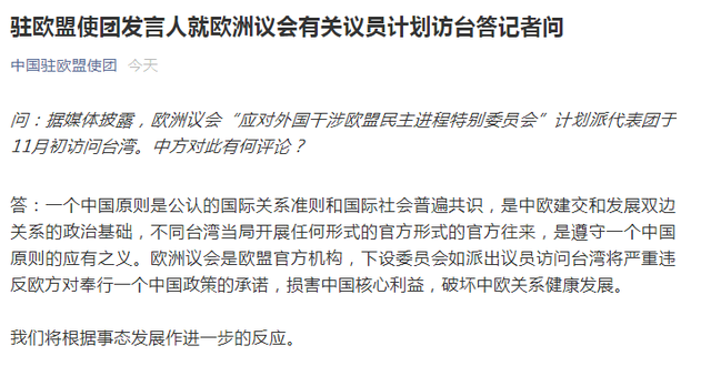 我駐歐盟使團(tuán)發(fā)言人27日就歐洲議會(huì)有關(guān)議員計(jì)劃訪臺(tái)還表示,歐洲議會(huì)是歐盟官方機(jī)構(gòu),下設(shè)委員會(huì)如派出議員訪問(wèn)臺(tái)灣將嚴(yán)重違反歐方對(duì)奉行一個(gè)中國(guó)政策的承諾,損害中國(guó)核心利益,破壞中歐關(guān)系健康發(fā)展。發(fā)言人強(qiáng)調(diào),我們將根據(jù)事態(tài)發(fā)展作進(jìn)一步的反應(yīng)。