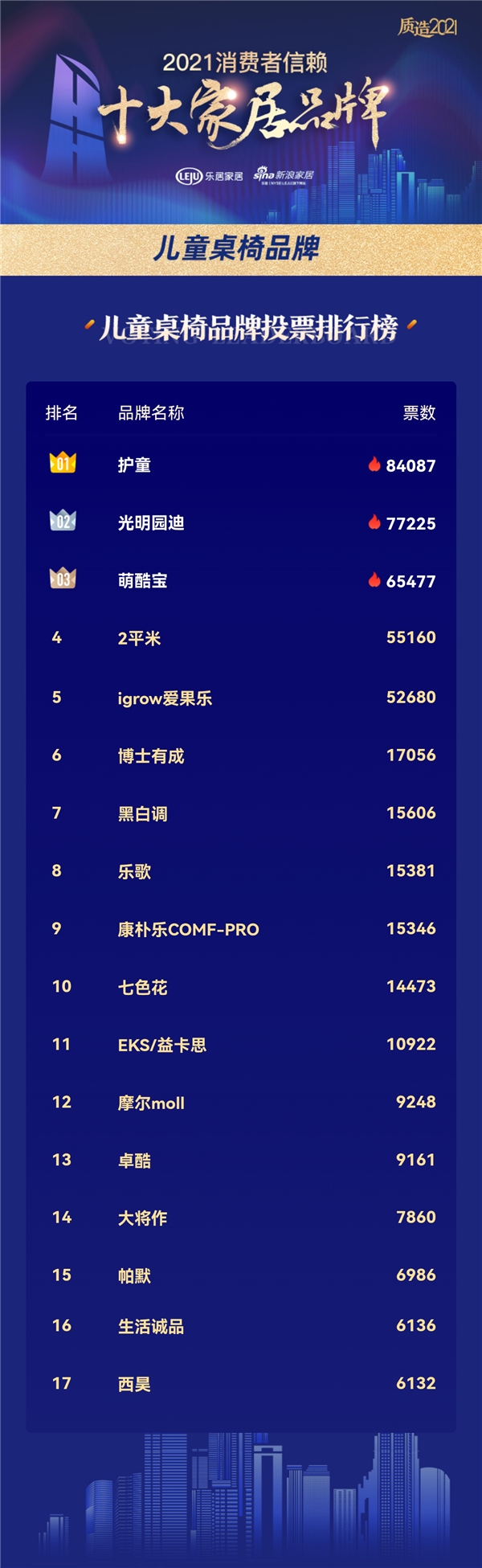 2021年11月2日,“2021消費(fèi)者信賴十大家居品牌”網(wǎng)絡(luò)投票評(píng)選活動(dòng)正式結(jié)束。通過(guò)消費(fèi)者票選、專家評(píng)審、設(shè)計(jì)師與工長(zhǎng)投票等環(huán)節(jié)層層嚴(yán)選,作為兒童學(xué)習(xí)桌行業(yè)標(biāo)準(zhǔn)起草承擔(dān)單位護(hù)童科技,一路披荊斬棘,憑借一直以來(lái)過(guò)硬的產(chǎn)品品質(zhì)、專業(yè)的服務(wù)體系等綜合優(yōu)勢(shì),獲得網(wǎng)友一致好評(píng),最終榮登兒童桌椅品牌榜首。