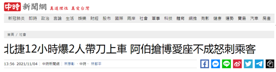 “中時(shí)新聞網(wǎng)”還提到,今天上午9時(shí)15分,又有民眾發(fā)現(xiàn)另一名男乘客在臺(tái)北捷運(yùn)公館站,拿出刀具嚇人,警方到場(chǎng)了解后,發(fā)現(xiàn)該名男子是把水果刀放在褲子口袋內(nèi),因坐下后時(shí)發(fā)現(xiàn)刀具卡住,才把刀具從褲子拿出,此舉引起附近民眾恐慌,警方后續(xù)到場(chǎng)也將該男子帶走調(diào)查。
