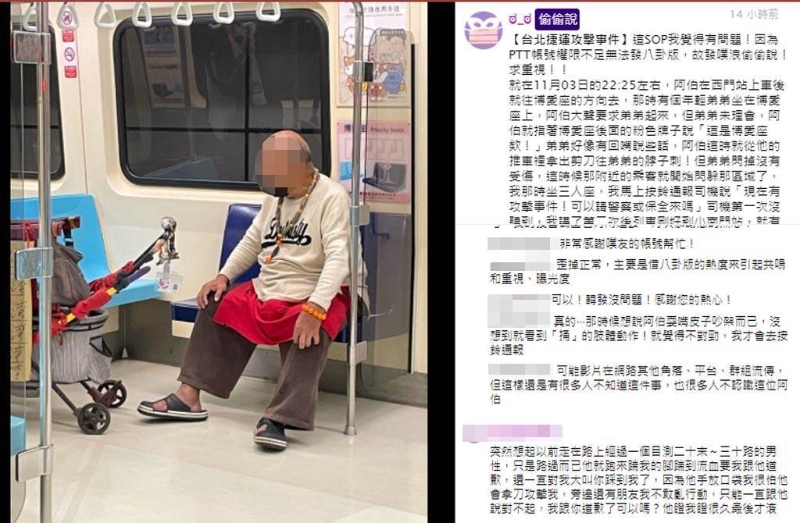 網(wǎng)友在網(wǎng)上發(fā)布一年長(zhǎng)乘客因“博愛(ài)座”被占拿剪刀攻擊乘客。圖自臺(tái)灣“中時(shí)新聞網(wǎng)”