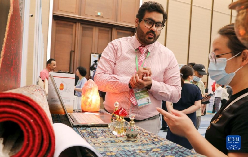 在國家會(huì)展中心(上海),參加第四屆進(jìn)博會(huì)上海招商路演暨消費(fèi)品展區(qū)展前供需對(duì)接會(huì)的一名參展企業(yè)工作人員(左)向參會(huì)嘉賓介紹產(chǎn)品(7月15日攝)。新華社記者
