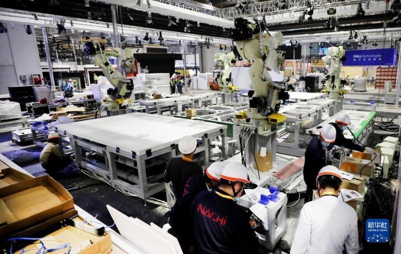 施工人員在第四屆進(jìn)博會(huì)展館內(nèi)為一家機(jī)器人企業(yè)布置展臺(tái)(10月29日攝)。新華社記者 方喆 攝