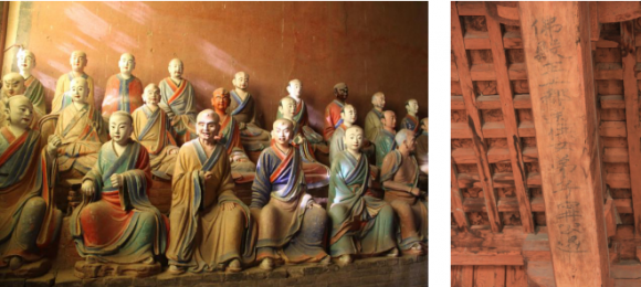 對(duì)了,悄悄告訴你,南禪寺大殿中還保留著唐代的塑像,而在它的太平梁上,還有著唐代的墨書(shū)題記,點(diǎn)明了它的重建時(shí)間是唐德宗建中三年(782)。