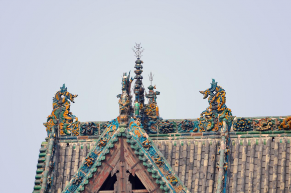 祆神樓在建造時(shí)融入了許多與我國(guó)傳統(tǒng)建筑不同的獨(dú)特風(fēng)格,比如說(shuō),在祆神樓的雕刻和塑像中,有著牛頭天神圖像、牧羊犬、神牛等在傳統(tǒng)建筑中不常見(jiàn)的元素;在屋脊上一排排各色琉璃構(gòu)件中,有幾位人物看起來(lái)十分特殊,再仔細(xì)看看,原來(lái)他們不同于漢人的裝束和形象,而是穿著胡人服飾的祆教徒??梢哉f(shuō),祆神樓是我國(guó)與絲綢之路國(guó)家建立友好關(guān)系、尊重外來(lái)宗教信仰的見(jiàn)證。