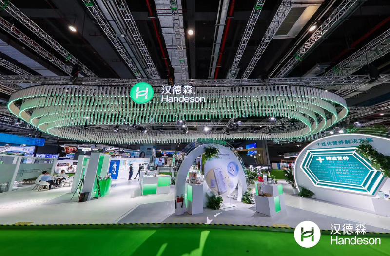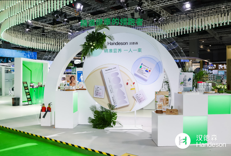 走進漢德森展位,“個性化營養(yǎng)解決方案”的宣傳語十分引人注目!整個展區(qū)白綠相間,場景設(shè)計錯落有致,各樣優(yōu)質(zhì)營養(yǎng)品整齊擺放,吸引了不少觀眾駐足咨詢。