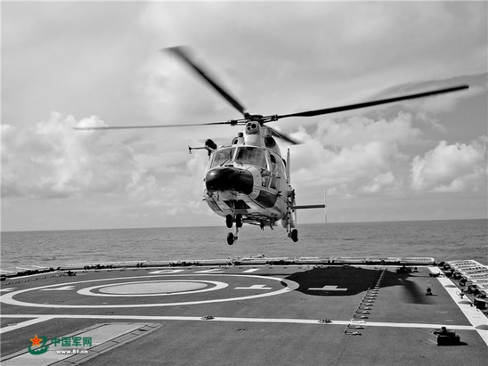 上圖:艦載直升機(jī)進(jìn)行著艦訓(xùn)練。資料照片