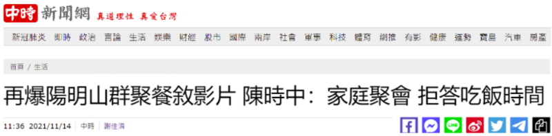 “中時(shí)新聞網(wǎng)”、中天電視等多家臺(tái)媒今日爆料,稱臉書(shū)上瘋傳他在臺(tái)北陽(yáng)明山戶外花園聚餐的視頻,現(xiàn)場(chǎng)采用自助餐方式,人數(shù)逾10人,全場(chǎng)無(wú)人戴口罩,視頻中陳時(shí)中大展歌喉。陳時(shí)中今日(14日)上午對(duì)此僅簡(jiǎn)單回應(yīng)是“家庭私人聚會(huì)”。