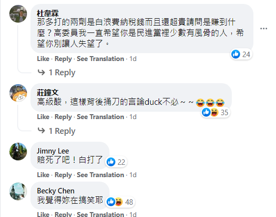 在評論區(qū)和其他推文中,對高嘉瑜此舉最為憤怒的反而是民進黨的支持者。畢竟對于政敵而言,靠走“花瓶”路線起家、缺乏行政和防疫專業(yè)素養(yǎng)的高嘉瑜說了句傻話,無非是多了一個笑料,但在民進黨的支持者眼里,高嘉瑜此舉暴露了自己陣營無能、出爾反爾的一面,洗地不成還給對面送了“彈藥”,達(dá)到了“低級綠,高級黑”的效果。