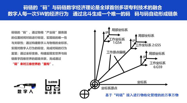 隨著信息技術(shù)的演進(jìn),徐蔚博士基于北斗坐標(biāo)系統(tǒng)、5G通信等技術(shù),創(chuàng)建了“唯一的、可識(shí)別、可定位、可跟蹤”的物格數(shù)字空間,創(chuàng)造性的將“碼”擴(kuò)展延伸至“物格”空間,實(shí)現(xiàn)了從碼鏈“數(shù)字人”、碼鏈“數(shù)字物”到碼鏈“數(shù)字地球”的碼鏈體系結(jié)構(gòu)的演進(jìn),將“掃一掃”升級(jí)到可穿戴智能終端御空眼鏡“看一看”,構(gòu)建了一個(gè)人與人、人與物、人與場(chǎng)(地)隨時(shí)隨地鏈接的泛在網(wǎng)絡(luò),基于對(duì)物理世界人、物、場(chǎng)的數(shù)據(jù)采集、處理、儲(chǔ)存、傳遞,構(gòu)建一個(gè)與物理空間泛在連接、相互映射、實(shí)時(shí)聯(lián)動(dòng)、精準(zhǔn)反饋、系統(tǒng)自治,真實(shí)反映人類社會(huì)行為的平行數(shù)字世界。至此,徐蔚博士基于北斗+5G構(gòu)造了碼鏈新型數(shù)字基礎(chǔ)設(shè)施,為人類社會(huì)提供一個(gè)面向角色、面向場(chǎng)景、響應(yīng)需求的碼鏈數(shù)字化解決方案。