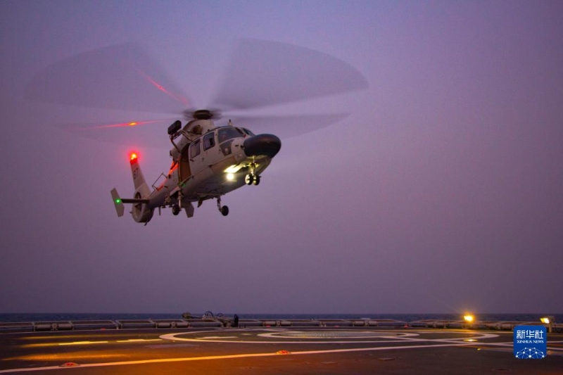 中國海軍第38批護(hù)航編隊南京艦在亞丁灣某海域組織艦載直升機(jī)跨晝夜飛行訓(xùn)練(6月16日攝)。新華社發(fā)(王宗洋 攝)