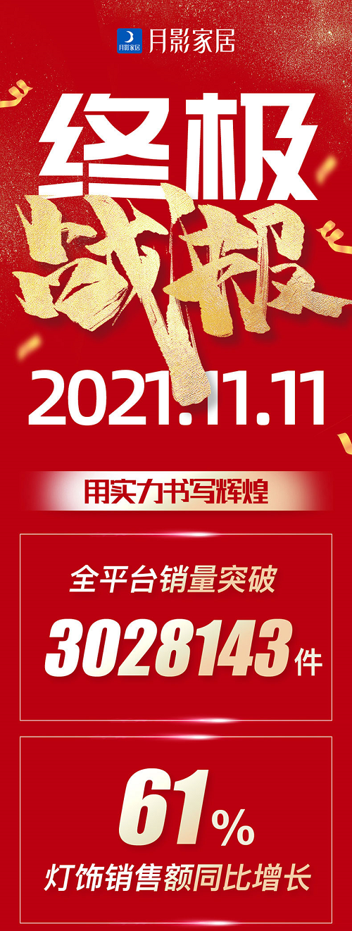 2021年11月12日零點(diǎn),本季天貓雙11完美收官,作為天貓美家TOP3的月影燈飾斬獲了“連續(xù)2年蟬聯(lián)第一”的王冠業(yè)績(jī)。與此同時(shí),全網(wǎng)銷(xiāo)量突破300萬(wàn)件,燈飾銷(xiāo)售額同比增長(zhǎng)61%,家具銷(xiāo)售額同比增長(zhǎng)256%。京東銷(xiāo)售額同比增長(zhǎng)424%,新零售銷(xiāo)售額同比增長(zhǎng)321%,新媒體銷(xiāo)售額同比增長(zhǎng)304%。輕奢全銅分子吊燈登頂天貓吊燈熱銷(xiāo)榜No.1,并入選2021天貓魯班之星榜單。