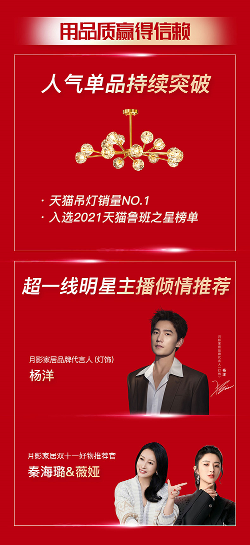 通過(guò)自媒體內(nèi)容傳播、新社交媒體產(chǎn)品種草拉力、橫跨大半個(gè)中國(guó)的99大屏燃情助威、“慕光之城”快閃店網(wǎng)紅打卡回溯照明時(shí)代變遷、超一線(xiàn)頂流明星直播間聯(lián)袂助陣等一系列數(shù)字化營(yíng)銷(xiāo)活動(dòng),作為在家居家裝行業(yè)燈飾類(lèi)目中,唯一成功入選2021年度天貓雙十一聯(lián)合傳播的頭部品牌,月影家居為本季雙11定制演繹了一場(chǎng)史無(wú)前例的海陸空全維度的品牌營(yíng)銷(xiāo)大秀。這些都彰顯出月影家居與消費(fèi)者高頻互動(dòng)、共情鏈接的“用戶(hù)思維”,以及月影家居品牌“數(shù)字化”的基因優(yōu)勢(shì)。