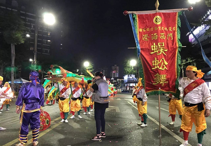 蜈蚣舞是一種大型的廣場性動物舞蹈,起源于清代同治至光緒年間,由西門鄉(xiāng)人陳成錦與其好友石文勇首創(chuàng)。蜈蚣舞根據(jù)蜈蚣的動態(tài)和習(xí)性進(jìn)行模仿,表演者半蹲的姿勢起舞,模擬蜈蚣蜿蜒爬行,穿梭盤繞,惟妙惟肖,受到民眾的喜愛并流行開來,傳沿至今。