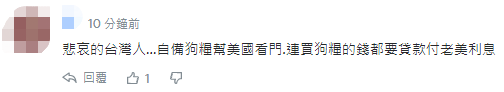 對此,有島內(nèi)網(wǎng)友痛斥,“悲哀的臺灣人……自備狗糧幫美國看門,連買狗糧的錢都要貸款付老美利息”。