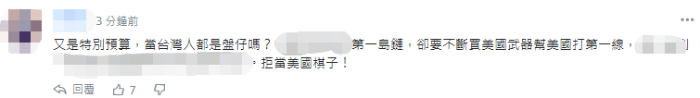 還有網(wǎng)友直斥:又是“特別預(yù)算”,當(dāng)臺灣人都是盤仔(肥羊)嗎?拒當(dāng)美國棋子!↓