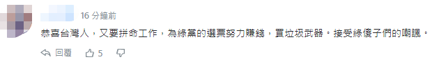 也有網(wǎng)友諷刺:臺灣人又要拼命工作,為民進黨的選票努力賺錢,還要買垃圾武器?!?/p>