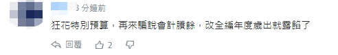 另有網(wǎng)友認(rèn)為,“(民進黨當(dāng)局)狂花特別預(yù)算,再來騙說會計剩余,改全編年度歲出(財政支出總和)就露餡了”?!?/p>