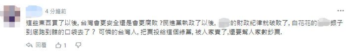 更有網(wǎng)友質(zhì)疑,這些東西買了以后,臺灣會更安全還是會更腐敗?民進黨“執(zhí)政”了以后,“政府”的財政紀(jì)律就破敗了, 白花花的銀子到底跑到誰的口袋去了?可憐的臺灣人,把票投給這個綠黨,被人家賣了,還要幫人家數(shù)鈔票。