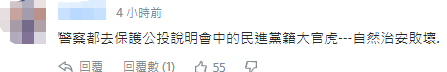 另有網(wǎng)友認(rèn)為,“警察都去保護(hù)‘公投’說(shuō)明會(huì)中的民進(jìn)黨籍大官虎---自然治安敗壞。”↓