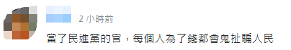 有人稱,“當(dāng)了民進(jìn)黨的官,每個人為了錢都會鬼扯騙人民?!?/p>