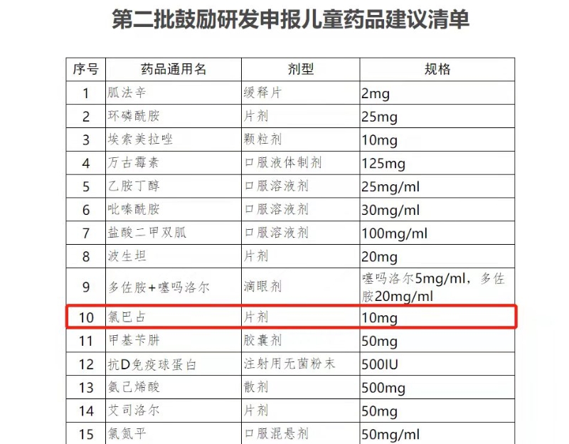 ▲2017年5月12日,國家衛(wèi)生健康委員會發(fā)布《關(guān)于第二批鼓勵研發(fā)申報兒童藥品建議清單的公示》,清單中第10項為規(guī)格10mg的“氯巴占 ”。圖/國家衛(wèi)生健康委員會官網(wǎng)截圖