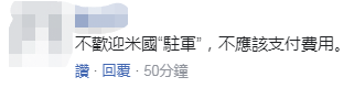 對此,有島內(nèi)網(wǎng)友直言,“不歡迎米(美)國‘駐軍’,(臺灣)不應(yīng)該支付費(fèi)用。”↓