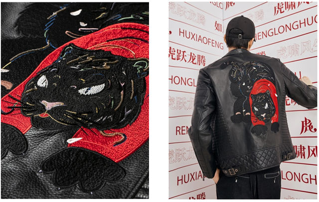 16萬針、6小時手工繡制,重工刺繡皮茄克 前胸和后背均采用了刺繡與手工串珠工藝。后背的整只滴水獸虎更是采用16萬針重工工藝,每一個刺繡片總耗時需要6個小時純手工匠制的刺繡圖案,經(jīng)過特殊工藝處理后,廓形硬挺但觸感柔和,讓整件茄克剛中帶柔。