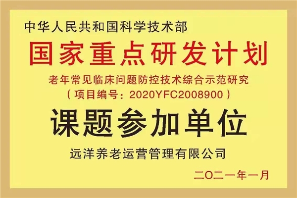國家重點(diǎn)研發(fā)計(jì)劃老年常見臨床問題防控技術(shù)綜合示范研究課題參加單位,遠(yuǎn)洋養(yǎng)老運(yùn)營管理有限公司。