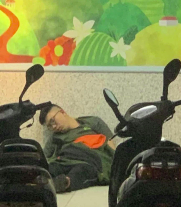 何姓下士身著軍服坐在營區(qū)對面一家便利店旁呼呼大睡。圖自臺媒