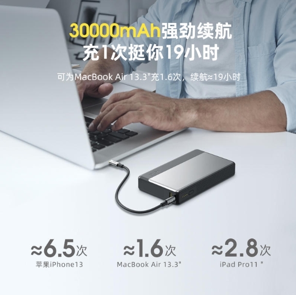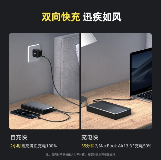 值得一提的是,AOHi該款充電寶的雙向快充功能,自充和充電功率均比5V1A快20倍,對平常工作效率的提升起到不小作用。根據(jù)AOHi官方測試數(shù)據(jù)可知,給產(chǎn)品自充僅需2小時即可滿血(自充按最大功率計算);日常出門前只需要抽出10分鐘自充,存儲電量可給iPhone13充電約95%。而為其他設備充電,以Macbook Air13.3”充電為例,充夠50%僅需半小時,而30000mAh的容量,可為該型號電腦充1.6次,最長續(xù)航時間達到15小時以上,再加上其出色的兼容性,特別是對高性能、功率在100W以下的筆記本,如蘋果96W和87W性能本,也能輕松勝任。