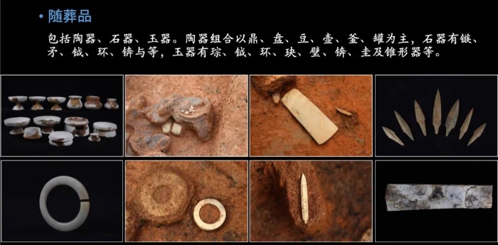 “墓葬區(qū)共發(fā)掘墓葬66座,可見一次葬、二次葬和遷出葬現(xiàn)象,少數(shù)墓葬保存了木質葬具殘痕與人骨遺存,這在嶺南同類遺址中極為罕見?!睆V東省文物考古研究所研究員劉鎖強在會上介紹,隨葬陶器組合以鼎、盤、豆、壺、罐為主,磨制石器以鏃、錛為主,玉器有琮、鉞、環(huán)、玦、璧、錛、錐形器及圭形器等,以玉鉞為最大宗。