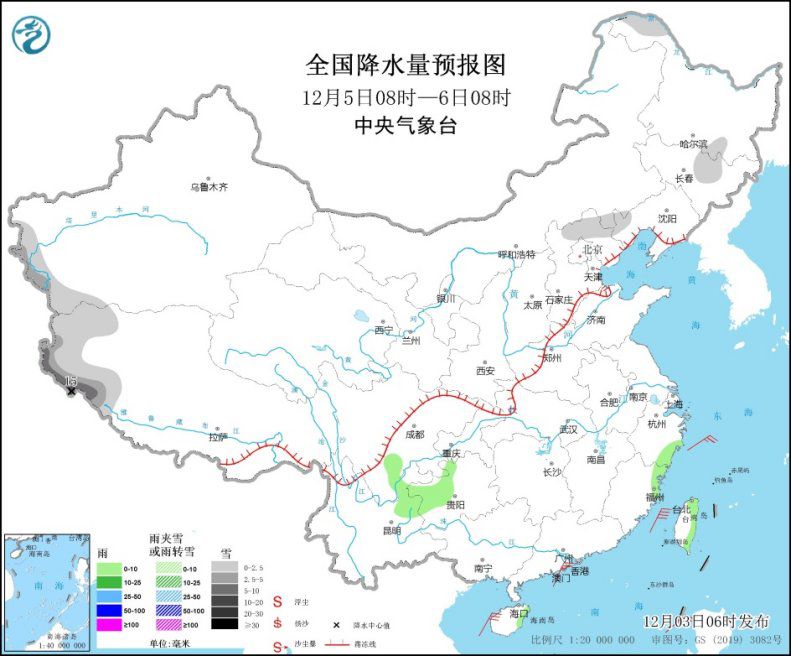 12月5日08時至6日08時,西藏西部、河北北部等地部分地區(qū)有小到中雪,其中,西藏西部等地部分地區(qū)有大到暴雪(10~15毫米)。浙江中南部、福建東北部、四川南部、貴州中西部、云南東北部、海南島東北部、臺灣島北部和東部等地部分地區(qū)有小雨。我國東南部海區(qū)有有6~7級東北風。
