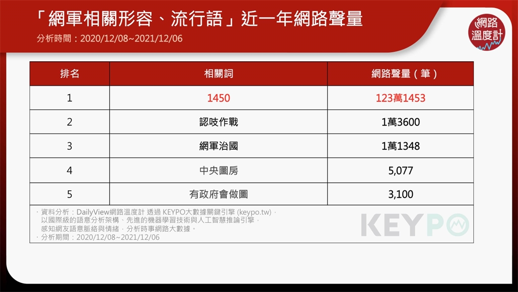 透過《KEYPO大數(shù)據(jù)關(guān)鍵引擎》(2020/12/08~2021/12/06)進(jìn)一步分析,網(wǎng)軍現(xiàn)象出現(xiàn)之后,陸續(xù)爆出不少爭議事件,連帶衍生不少新的形容和流行詞,其中“1450”更是成為民進(jìn)黨和泛綠陣營的網(wǎng)軍代名詞,“1450”光是近一年的網(wǎng)絡(luò)討論度就超過123萬筆;第二名為“認(rèn)吱作戰(zhàn)”,PTT上有網(wǎng)友解釋該詞的意思是“批評執(zhí)政黨就是中共同路人”;第三名為“網(wǎng)軍治臺”,接下來則是“中央圖房”、“有政府會做圖”。上述的這些網(wǎng)軍流行詞,其中有些說法,是網(wǎng)友們發(fā)揮創(chuàng)意,改變臺當(dāng)局的口號、標(biāo)語,例如,過去蘇貞昌的社交賬號上常出現(xiàn)的口號“有政府會做事”,就被改成“有政府會做圖”等等,配合時(shí)事的網(wǎng)軍哏詞,更容易引發(fā)討論和話題。