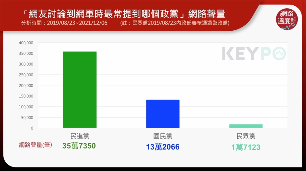 網(wǎng)軍議題吵得沸沸揚(yáng)揚(yáng),藍(lán)綠白各黨之間也曾互批對方養(yǎng)網(wǎng)軍,而網(wǎng)友們討論到網(wǎng)軍話題時(shí),最常提到哪一個(gè)政黨呢,根據(jù)《KEYPO大數(shù)據(jù)關(guān)鍵引擎》(2019/08/23~2021/12/06)統(tǒng)計(jì)調(diào)查,第一名是民進(jìn)黨,網(wǎng)絡(luò)聲量高達(dá)35萬7350筆,顯示網(wǎng)友認(rèn)為網(wǎng)軍和民進(jìn)黨的連結(jié)度相對較高。而在高嘉瑜、林秉樞事件當(dāng)中,意外衍生出的網(wǎng)軍爭議,身為高嘉瑜好友的民進(jìn)黨“立委”何志偉,語出驚人表示“PTT應(yīng)該要關(guān)掉”,引發(fā)鄉(xiāng)民炸鍋,因此,何志偉更被翻出他曾經(jīng)自曝當(dāng)過網(wǎng)軍,擁有3個(gè)賬號。