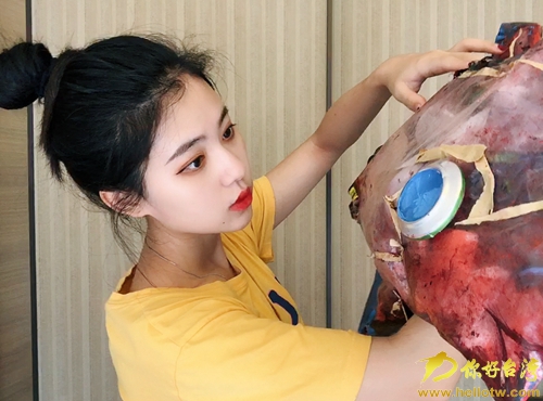 香港女生陳濼屹的作品《侵蝕》,制作的是一條被人類生活垃圾填充的“魚”,顏料處理的紅色“鮮血”觸目驚心,看到作品的同時立刻意識到海洋污染的嚴(yán)重性 。