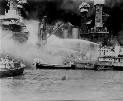 上圖:珍珠港事件中,美軍“西弗吉尼亞”號戰(zhàn)列艦起火燃燒。資料圖片