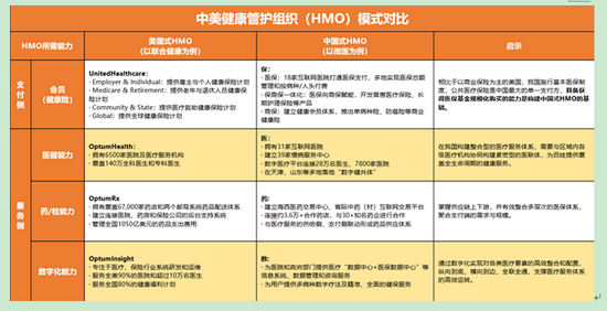 值得一提的是,1973年為了遏制快速增長的醫(yī)療支出,美國推出《健康維護組織法》,鼓勵健康維護組織 (HMO) 的快速發(fā)展,在此背景下全球知名健康管護組織——聯(lián)合健康應運而生。盡管中美醫(yī)療體制大相徑庭,但通過構(gòu)建健康管護體系,加強對醫(yī)院、醫(yī)生等各方的有效管控以及對患者的健康維護,實現(xiàn)整個健康服務(wù)體系降本增效的內(nèi)核是相通的。從這個意義講,“聯(lián)合健康”的模式對于構(gòu)建“以健康為中心”的健康維護體系具有重要參考意義。