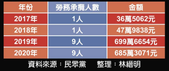 臺行政機(jī)構(gòu)近4年勞務(wù)承攬人數(shù)及金額。圖片來源:臺灣《中時電子報》