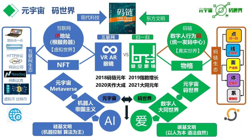 碼鏈重構(gòu)的新世界是碼的世界,碼世界對應(yīng)的是現(xiàn)實世界中的地球世界,地球是以人為本的,是真實的,元宇宙對應(yīng)的是機器取代人類,算法消滅人類的互聯(lián)網(wǎng)虛擬世界。