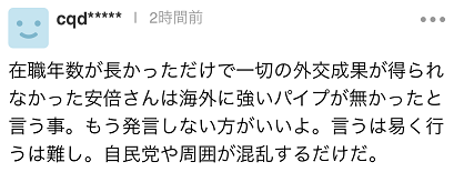 消息傳回日本,安倍晉三近期作秀成癮也讓部分日本網(wǎng)民厭煩。有人稱:“這個(gè)人說的話不能信”?!爸粫?huì)打嘴炮”。還有人評論稱:“安倍在職首相時(shí)間雖長,但沒有取得任何外交成果,這代表他在海外沒有有力渠道。安倍最好還是別說話了。言之非難,行之為難。(安倍發(fā)言)只會(huì)讓自民黨內(nèi)部和安倍周邊人士混亂?!?/p>