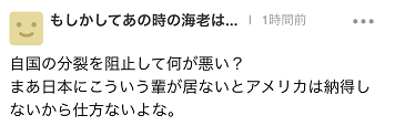 此外,有人說,“(中國)阻止國家分裂有什么問題嗎?不過沒有辦法,如果在日本沒有這種家伙(安倍等極端右翼政客)存在的話,美國是不會(huì)同意的?!?/p>