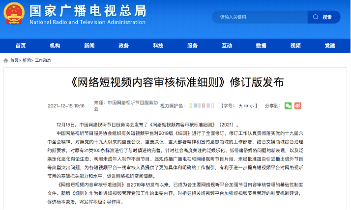 12月15日,中國網(wǎng)絡(luò)視聽節(jié)目服務(wù)協(xié)會發(fā)布《網(wǎng)絡(luò)短視頻內(nèi)容審核標(biāo)準(zhǔn)細(xì)則》(2021),對2019版《細(xì)則》進(jìn)行全面修訂,完善了原有21類100條標(biāo)準(zhǔn),針對社會高度關(guān)注的泛娛樂化、低俗庸俗媚俗問題的新表現(xiàn),以及泛娛樂化惡化輿論生態(tài)、利用未成年人制作不良節(jié)目、違規(guī)傳播廣播電視和網(wǎng)絡(luò)視聽節(jié)目片段、未經(jīng)批準(zhǔn)擅自引進(jìn)播出境外節(jié)目等典型突出問題,為各短視頻平臺一線審核人員提供了更為具體和明確的工作指引。《細(xì)則》中列舉了100種短視頻節(jié)目及其標(biāo)題、名稱、評論、彈幕、表情包等,其語言、表演、字幕、畫面、音樂、音效中不得出現(xiàn)的內(nèi)容,其中包括未經(jīng)授權(quán)自行剪切、改編電影、電視劇、網(wǎng)絡(luò)影視劇等各類視聽節(jié)目及片段,表現(xiàn)未成年人早戀的,以及抽煙酗酒、打架斗毆、濫用毒品等不良行為,破壞生態(tài)環(huán)境,虐待動物,捕殺、食用國家保護(hù)類動物等。>>>【詳文】