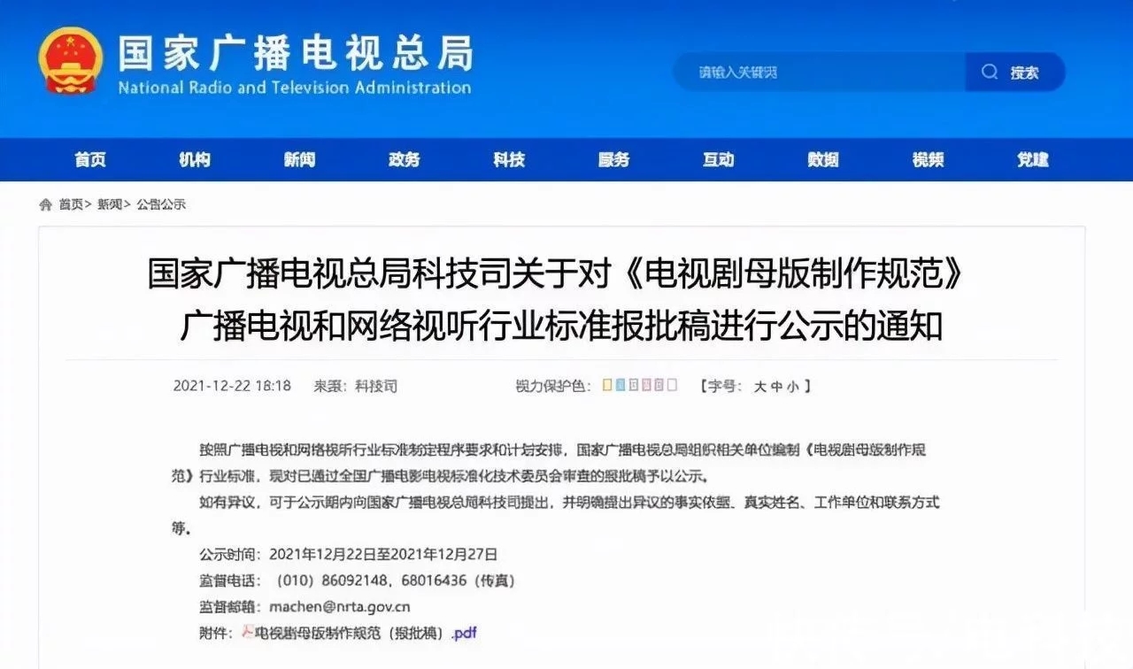 12月27日,國家廣播電視總局《電視劇母版制作規(guī)范》公示截止。新規(guī)對電視劇母版制作要求的時長、署名、圖像、聲音、字幕、封裝格式和技術(shù)質(zhì)量都提出了明確要求,并給出了聲畫質(zhì)量主觀評價方法。其中,未來觀眾體驗最大的變化將是,常規(guī)劇集正片時長將不少于41分鐘,過去30分鐘左右的彈性片長劇集不再合規(guī);另外,每集結(jié)尾畫面與下一集的開始畫面如有重復(fù)內(nèi)容,時長將不超過30秒,靠前情回顧、下集預(yù)告“抻”片長、“注水”劇情的情況將被有效遏制。>>>【詳文】
