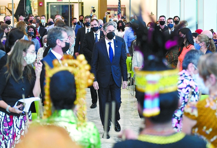 14日,正在印尼訪問的美國務(wù)卿布林肯到美國駐雅加達大使館參加活動。