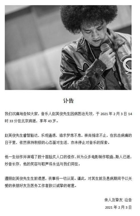 2月3日,音樂人趙英俊親友發(fā)布訃告,稱趙英俊因病醫(yī)治無效,于2021年2月3日14時33分在北京去世,終年43歲。趙英俊曾為《唐人街探案》《煎餅俠》《港囧》等多部電影等創(chuàng)作歌曲。得知消息后,大鵬、喬杉、韓延、張杰、包貝爾、徐崢等明星紛紛發(fā)文悼念。 >>>進入詳文