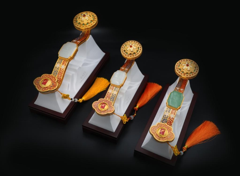 據(jù)主創(chuàng)人員中國工藝美術(shù)大師王樹文先生介紹,花絲鑲嵌又叫細(xì)金工藝,是一門傳承久遠(yuǎn)的中國傳統(tǒng)手工技藝,是“花絲”和“鑲嵌”兩種制作技藝的結(jié)合,2008年6月被列入國家級非物質(zhì)文化遺產(chǎn)名錄?!岸瑠W冰雪花絲如意”頭部采用花絲鑲嵌技藝中的掐、填、攢、焊、編等工序和鑲嵌技藝中的多道工序制作完成,既突顯了非遺技藝的無窮魅力,又表現(xiàn)了中國如意文化的內(nèi)涵。
