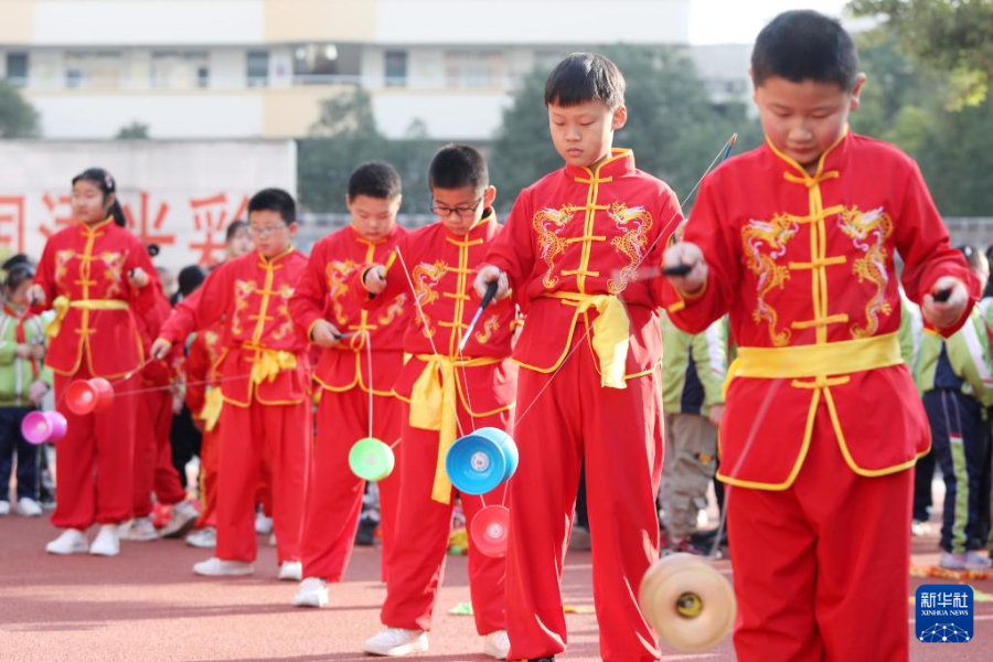 11月15日,淮北市第三實驗小學(xué)的學(xué)生練習(xí)抖空竹。(來源:新華社)