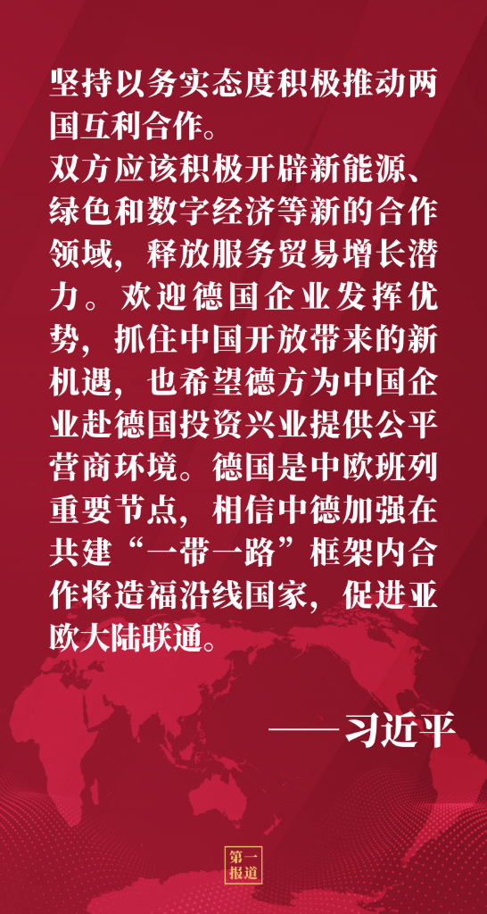 第二,堅持以務(wù)實態(tài)度積極推動兩國互利合作。中德兩國經(jīng)濟都從對方發(fā)展中獲益良多。中國已連續(xù)5年成為德國最大貿(mào)易伙伴,雙邊經(jīng)貿(mào)合作頂住新冠肺炎疫情壓力實現(xiàn)逆勢增長。雙方應(yīng)該積極開辟新能源、綠色和數(shù)字經(jīng)濟等新的合作領(lǐng)域,釋放服務(wù)貿(mào)易增長潛力。歡迎德國企業(yè)發(fā)揮優(yōu)勢,抓住中國開放帶來的新機遇,也希望德方為中國企業(yè)赴德國投資興業(yè)提供公平營商環(huán)境。德國是中歐班列重要節(jié)點,相信中德加強在共建“一帶一路”框架內(nèi)合作將造福沿線國家,促進(jìn)亞歐大陸聯(lián)通。